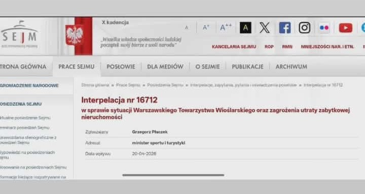 Historyczny budynek przy ul. Foksal 19 w Warszawie. Majątek, nie dorobek, a majątek Warszawskiego Towarzystwa Wioślarskiego. Różnice poglądowe między wizjonerami, działaczami o te właśnie dziedzictwo klubowe trwa od lat. Pretekstem do popełnienia tego artykułu stała się interpelacja poselska z dnia 20 kwietnia 2026 r. skierowana do Ministra Sportu i Turystyki przez Pana Posła Grzegorza Płaczka. Ugrupowanie, strona partyjna Posła w naszej ocenie nie ma nic do rzeczy i świadomie została pominięta. Istotą jest działanie. Interpelację w swojej naturze poprzedza zainteresowanie, troska, wreszcie potrzeba uzyskania informacji w nurtującym temacie. Temacie, który to zainteresowanie budzi. Nas również żywo interesuje stan rzeczy pt. Foksal 19. Kłopoty finansowe najstarszego polskiego Towarzystwa Wioślarskiego nie są tajemnicą. W naszym odczuciu niestety skrzętnie ukrywane przez klubowe środowisko. Czy Magazyn SKIFF tą publikacją wbija przysłowiowy kij w mrowisko? Absolutnie nie to jest naszą intencją. Intencją jest potrzeba ujrzenia transparentnego obrazu sportowego bytu. Historycznej dumy miasta. Winni jesteśmy to inicjatorom, założycielom, twórcom tej kolebki polskich wioseł. Warszawskie Towarzystwo Wioślarskie zarządza niebagatelnym majątkiem. Majątkiem, którego wartość liczona jest w dziesiątkach milionów złotych. Wspomniana wcześniej zabytkowa kamienica w centrum miasta stanowi ogromną część tego majątku. Kamienica związana jest historycznymi „korzeniami” z tym miastem i tym Towarzystwem. Obiekt służący jeszcze całkiem niedawno społeczności sportowej. Zabytek, który przeżył rozbiory, wojny, czasy minionej epoki zwane komunizmem, transformację społeczno – polityczną ostatnich dekad. Chcemy wiedzieć, czy ta tożsamość historyczna zostanie temu środowisku odebrana. W związku z tym z ogromną radością przyjęliśmy zainteresowanie Posła RP, Pana Grzegorza Płaczka, który wystosował do Ministra Sportu i Turystyki stosowne zapytanie.